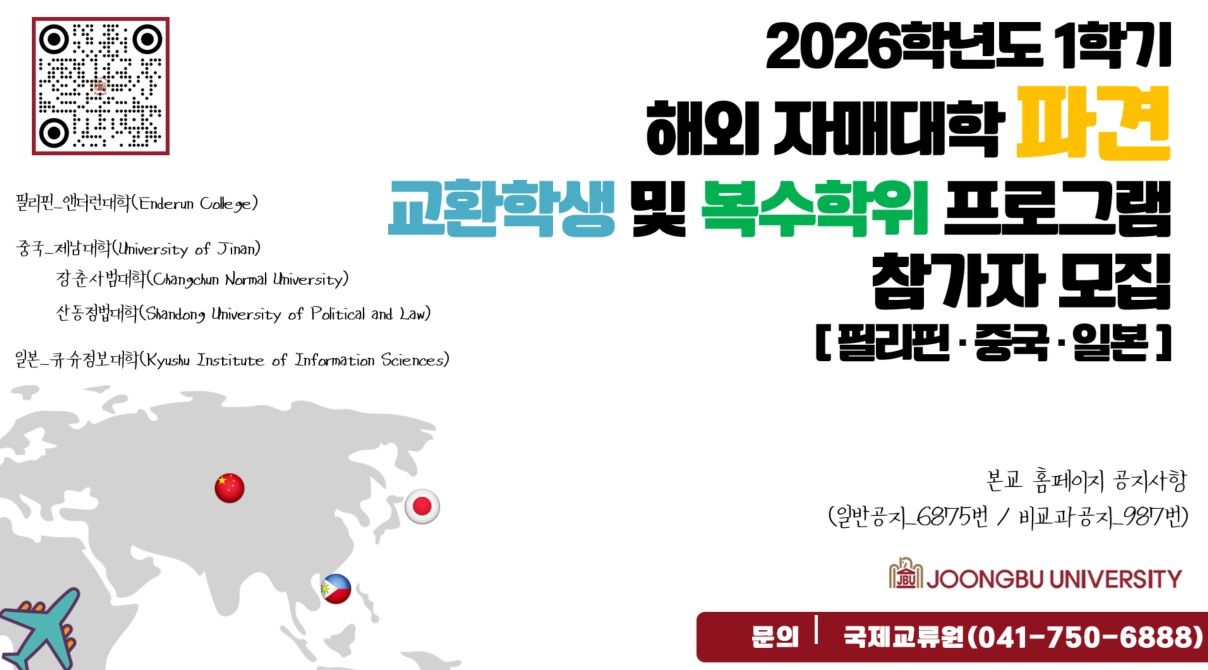 중부대학교에서 2026학년도 1학기 해외 자매대학 교환학생 및 복수학위 프로그램 참가자를 모집하고 있습니다. ![]()