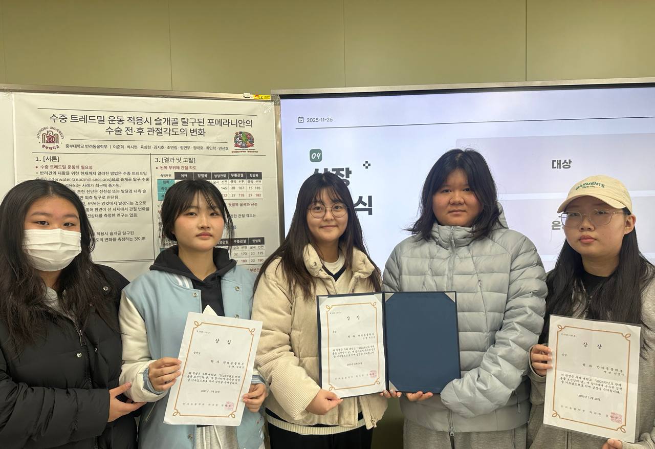 중부대학교(총장 이정열) 반려동물사육학전공•동물 보건학과는 지난 26일 ‘반려동물 보건인의 날’을 맞아 학부 학술제를 개최했다고 밝혔다. 이번 학술제는 교과목과 연계한 학생들의 연구 활동과 학술 발표를 중심으로 진행됐으며, 한 해 동안 이어진 지역사회 연계 봉사 프로그램 성과도 함께 공유하는 자리였다.