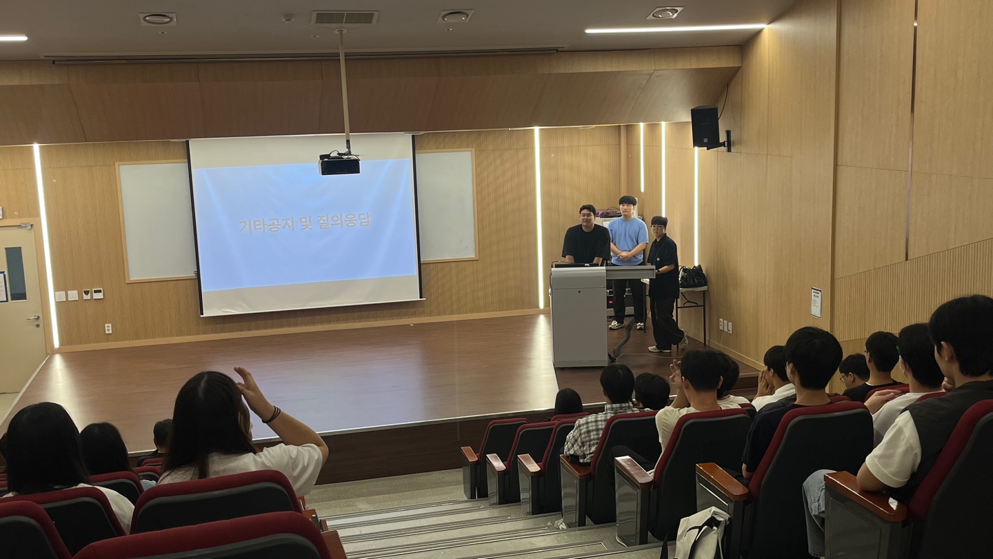 2025 09/09 2학기 개강 총회에서 교수님 말씀, 2학기 행사 안내, 총무결산, 복학생 인사, 임원진 소개 등의 시간을 가졌습니다.이번 학기 원하는 바 모두 이루시길 바랍니다.