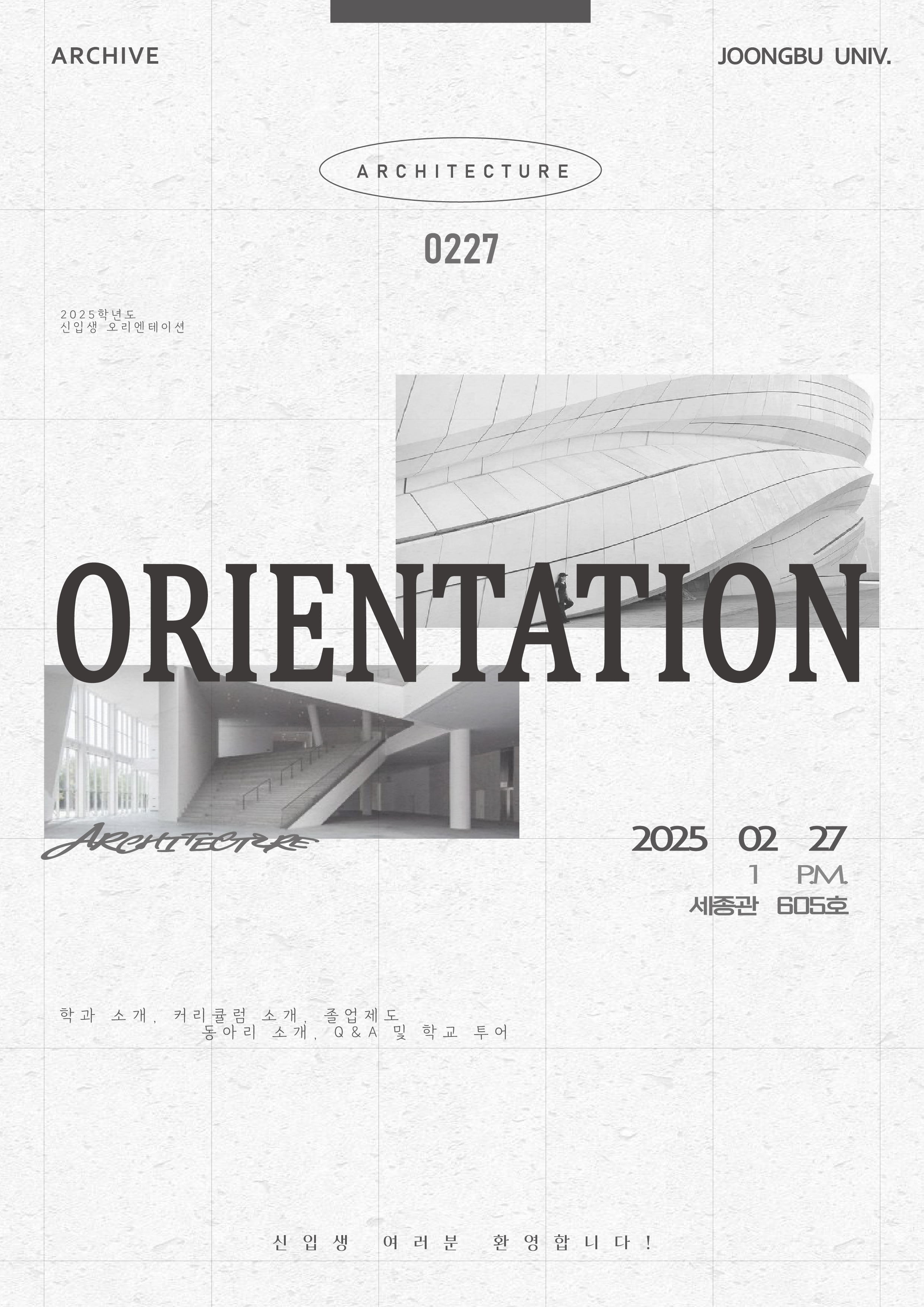 2025.02.27. (목) 13:00~ 건축학전공 2025년도 신입생 환영회를 진행하였습니다. 2025년도 입학생이 모여 신입생들은 학교생활을 앞두고 각종 전달사항들과 숙지사항을 들을 수 있는 기회가 되었고 선배들과 친해질 수 있는 계기가 되었습니다.